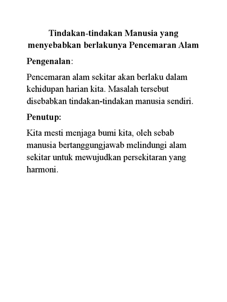 14 contoh karangan narasi tentang pendidikan, liburan, lingkungan, guru, sekolah juga pengalaman pribadi adalah karangan yang cerita untuk pembahasan kali ini kami akan memberikan ulasan mengenai contoh karangan narasi yang dimana dalam hal ini meliputi contoh tentang. Ipendidikan » karangan » contoh karangan punca pencemaran alam sekitar. Buktinya, para pengkaji menjumpai kesan terbakar di dinding gua tempat manusia tinggal pada zaman dahulu. Contextual translation of contoh karangan pencemaran alam sekitar into english. Sebagai contoh ialah perlombongan, penebangan hutan yang memyebabkan aliran tanah dari darat ke laut.