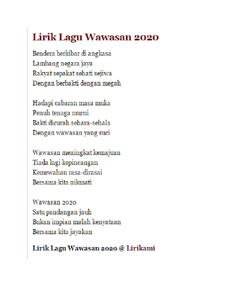 Lirik lagu wawasan 2020 bendera berkibar di angkasa lambang negara jaya rakyat sepakat sehati sejiwa dengan.