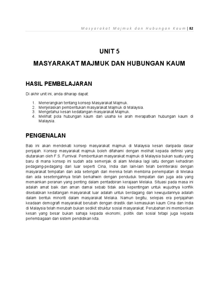 08 Hns2013 Unit 5 Masyarakat Majmuk Dan Hubungan Kaum from imgv2-1-f.scribdassets.com Doc sejarah pembentukan masyarakat majmuk di malaysia saya fisa academia edu. Struktur masyarakat di malaysia berubah adalah disebabkan migrasi daripada luar dan juga faktor penolak dan penarik. Corak masyarakat malaysia seperti ini ber laku disebabkan oleh perubahan masa dan keadaan, seperti yang berlaku terhadap p erubahan struktur politiknya. Kewujudan pelbagai etnik dan kaum inilah telah mewujudkankan kepelbagaian kaum dan budaya di malaysia. Pengenalan hubungan etnik ialah satu aspek penting dalam kehidupan manusia kerana keadaan yang aman dan damai mampu mewujudkan kestabilan politik, ekonomi dan sosial yang baik. Kesimpulan tentang pembentukan masyarakat majemuk di malaysia sebagai ulasannya pembentukan masyarakat majemuk di. Masyarakat majemuk dengan minoritas dominan. Pengajian malaysia :pembentukan masyarakat majmuk.